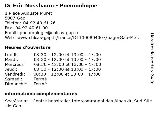 1 Dr Amaia David - Pneumologue (Distance: 0,00 km) 1 Place Auguste Muret, 05007 Gap amaia, consultation, david, docteur, dr, med, médecin, médecine, pneumologue, traitement 2 Dr Pascal Thomas - Pneumologue (Distance: 0,00 km) 1 Place Auguste Muret, 05007 Gap consultation, docteur, dr, med, médecin, médecine, pascal, pneumologue, thomas, traitement 3 Dr Marc di Francia - Pneumologue (Distance: 0,02 km) 1 Place Auguste Muret, 05000 Gap di, dr, francia, marc, médecins, médicaments, pneumologue, santé, secrétariat, spécialiste 5 Disdier Eric Pascal (Distance: 0,47 km) 8 Rue Docteur Roubaud, 05000 Gap disdier, eric, pascal, restaurants 6 Maître Eric Aeditti - Avocat (Distance: 0,62 km) 70 Boulevard Pompidou, 05000 Gap aeditti, avocat, droit, eric, juridictionnelle, maître, négociation |