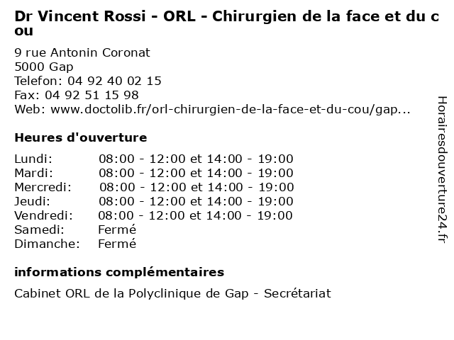 1 Dr Alain Brunet - ORL - Chirurgien de la face et du cou (Distance: 0,00 km) 9 Rue Antonin Coronat, 05000 Gap alain, brunet, chirurgie, chirurgien, consultation, cou, de, docteur, dr, du, et, face, faciale, la, maxillo, medecins, orl, santé, vous 2 Dr Jérôme Le Bourdon - ORL - Chirurgien de la face et du cou (Distance: 0,00 km) 9 Rue Antonin Coronat, 05000 Gap bourdon, chirurgien, cou, de, dr, du, et, face, jérôme, la, le, medecins, o.r.l, orl, rendez, santé, sur, vous 3 Dr Francesco Segala ORL - Chirurgien de la face et du cou (Distance: 0,00 km) 9 Rue Antonin Coronat, 05000 Gap chirurgien, cou, de, docteur, dr, du, et, face, francesco, la, orl, sante, segala, soins 4 Dr Alain Trovero - ORL - Chirurgien de la face et du cou (Distance: 0,18 km) 9 Rue Antonin Coronat, 05000 Gap alain, chirurgien, cou, de, dr, du, et, face, la, medecins, orl, oto, rendez, rhino, santé, sur, trovero, vous 5 Dr Eric Apap - ORL - Chirurgien de la face et du cou (Distance: 1,24 km) 11 Rue Carnot, 05000 Gap apap, chirurgien, cou, de, dr, du, eric, et, face, la, laryngologie, orl, oto, rhino 6 Dr Vincent Roux - Anesthésiste (Distance: 1,33 km) 1 Place Auguste Muret, 05007 Gap anesthésiste, consultation, docteur, dr, med, médecin, médecine, roux, traitement, vincent |