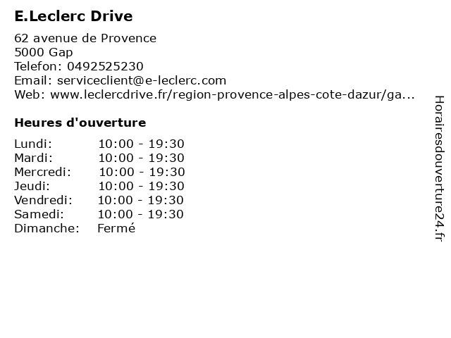 1 E.Leclerc Drive (Distance: 4,31 km) 59-61 Avenue Emile Didier, 05000 Gap discount, drive, e.leclerc, marche, supermarche 3 Auchan - Drive (Distance: 1,07 km) 9 Rue des Fusillés, 05000 Gap auchan, drive, hypermarche, marche, market 5 Leclerc-Mayet Elisabeth (Distance: 2,76 km) 6 Rue Cadet de Charance, 05000 Gap elisabeth, leclerc, mayet 6 |