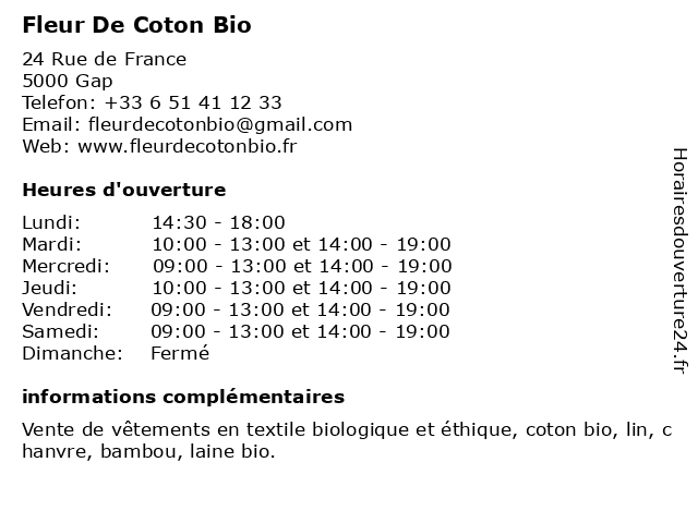 | Jeudi | 10:00-13:00 et 14:00-19:00 |