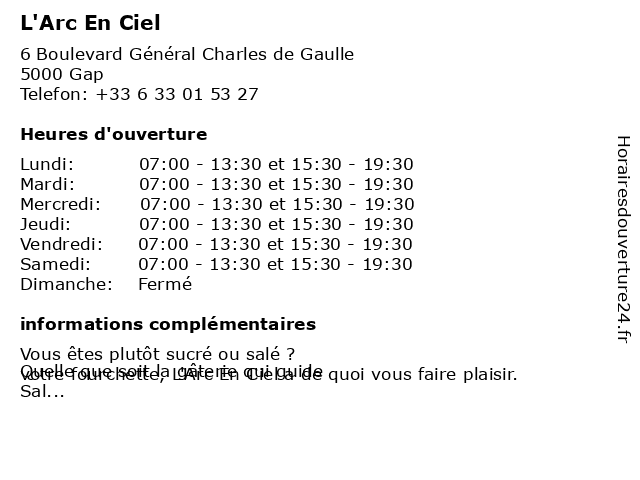 | Samedi | 07:00-13:30 et 15:30-19:30 |