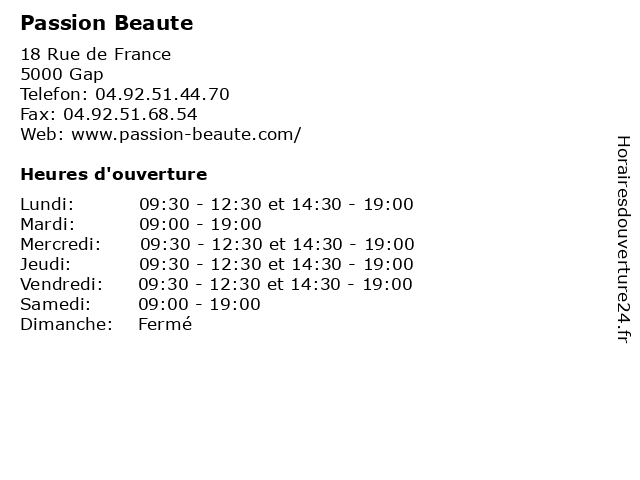 2 Ludivine Passion (Distance: 0,13 km) 26 Rue Perolière, 05000 Gap accessoires, bagages, ludivine, maroquinerie, passion, sacs 4 Passion Coiffure (Distance: 0,30 km) 11 Rue Louis Balmens, 05000 Gap balayage, coiffeur, coiffure, coloration, coupe, mèches, passion 5 Passion Piscines - Passion Bien-être (Distance: 1,09 km) 18 Avenue Émile Didier, 05000 Gap bien, passion, piscines, être 6 Passion Beauté (Distance: 1,33 km) - Route des Fauvins, 05000 Gap beauté, cosmétique, maquillage, parfum, passion |