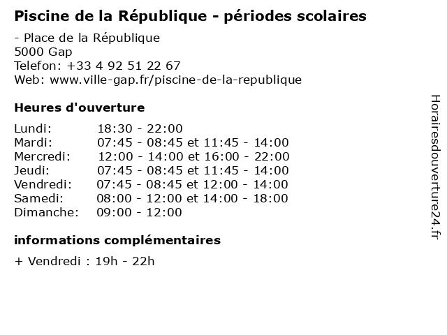 1 Piscine de la République - pendant les vacances scolaires (Distance: 0,00 km) - Place de la République, 05000 Gap aqua, aquatique, de, la, les, pendant, piscine, république, scolaires, vacances 2 Centre Social de Saint-Mens (Périodes Scolaires) (Distance: 1,20 km) Route de Molines, 05000 Gap activités, centre, de, famille, mens, périodes, saint, scolaires, social 3 Centre Social de Saint-Mens (Vacances Scolaires) (Distance: 1,20 km) Route de Molines, 05000 Gap activités, centre, de, famille, mens, saint, scolaires, social, vacances 4 Médiathèque Municipale - Périodes scolaires (Distance: 10,89 km) 1 rue des Sapins, 05130 Tallard cd, dvd, livres, mediatheque, municipale, médiathèque, périodes, revues, scolaires, vacances 5 Piscine de Tallard - juillet et août (Distance: 11,58 km) - Quartier le Chêne, 05130 Tallard août, aqua, aquatique, de, et, juillet, piscine, tallard 6 Centre Aquatique Intercommunal - Petites Vacances scolaires (Distance: 13,36 km) - Avenue de Merly, 05500 Saint-Bonnet-en-Champsaur aqua, aquatique, centre, intercommunal, petites, piscine, scolaires, vacances |