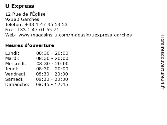 2 U Express (Distance: 3,81 km) 109 Avenue Paul Doumer, 92500 Rueil Malmaison express, magasin, nourriture, supermarché 3 4 U Express (Distance: 6,78 km) 1-3 Avenue Guy de Maupassant, 78400 Chatou express, magasin, nourriture, supermarché 5 U Express (Distance: 7,46 km) 50 Rue de la Fédération, 75015 Paris express, magasin, nourriture, supermarché 6 |