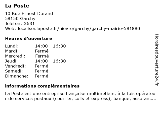 1 La Poste (Distance: 5,43 km) 26 Grande Rue, 58400 Narcy agence postale, courrier postal, expédition internationale, la, poste 2 La Poste (Distance: 6,16 km) 21 Bis Route d'Antibes, 58400 Mesves-sur-Loire agence postale, courrier postal, expédition internationale, la, poste 3 La Poste (Distance: 8,15 km) 17 Rue Saint Symphorien, 58150 Suilly-la-Tour agence postale, courrier postal, expédition internationale, la, poste 4 La Poste (Distance: 8,61 km) - Route de la Charité, 58400 Raveau agence postale, courrier postal, expédition internationale, la, poste 5 La Poste (Distance: 10,76 km) 4 place de la Mairie, 58150 Saint-Laurent-l'Abbaye colis, courrier, enveloppe, envoi, la, lettres, livraison, paquets, poste, relais colis, timbres 6 La Poste (Distance: 11,92 km) 2 Rue de la Poste, 58350 Colmery agence postale, courrier postal, expédition internationale, la, poste |