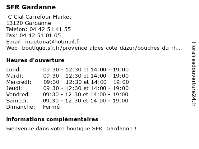 1 SFR (Distance: 4,77 km) - Les Allees, 13100 Aix-en-Provence abonnements de téléphonie mobile ou fixe fixe ou carte prépayée, accès internet haut débit ou la fibre optique ainsi que des abonnements à des bouquets de chaînes de télévision ., sfr, téléphones mobiles 2 SFR (Distance: 6,85 km) 3 Cours Mirabeau, 13100 Aix-en-Provence abonnements de téléphonie mobile ou fixe fixe ou carte prépayée, accès internet haut débit ou la fibre optique ainsi que des abonnements à des bouquets de chaînes de télévision ., sfr, téléphones mobiles 3 SFR (Distance: 8,35 km) 210 Avenue de Bredasque, 13090 Aix-en-Provence beaute, cafe, chaussures, enfants, hommes, lingerie, mode femmes, restaurant, sfr, sport 4 SFR (Distance: 9,57 km) s/n Chemin de la Grande Campagne, 13480 Cabriès boutiques, centre, commercial, espace, services, sfr, telephonie 5 SFR (Distance: 13,02 km) . Plan de Campagne, 13170 Les Pennes Mirabeau beaute, cafe, chaussures, enfants, hommes, lingerie, mode femmes, restaurant, sfr, sport 6 SFR (Distance: 13,28 km) 113 Route Nationale, 13127 Vitrolles accessories, cafe, costume, homme, mode, pantalons, pulls, restaurant, service, sfr |