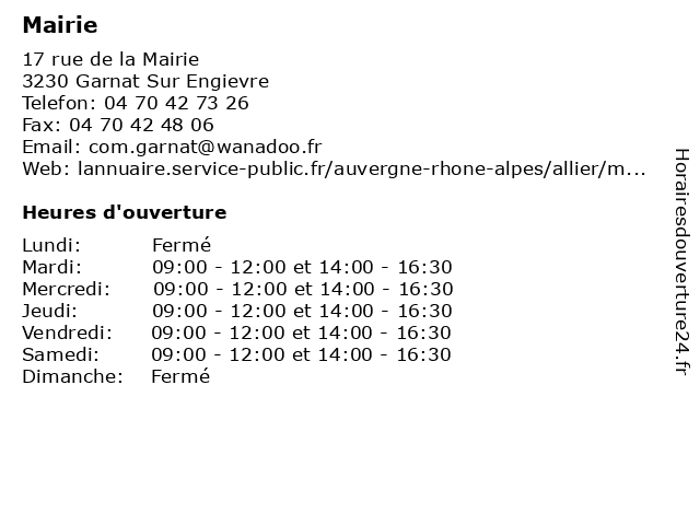 2 Mairie (Distance: 4,64 km) - Le Village, 03230 Paray Le Fresil administration, mairie, public, service 4 Mairie (Distance: 13,41 km) - Route de Vichy, 03290 Dompierre Sur Besbre administration, mairie, public, service 6 Mairie (Distance: 17,54 km) 62 rue de l'Agriculture, 03340 Montbeugny administration, mairie, public, service |