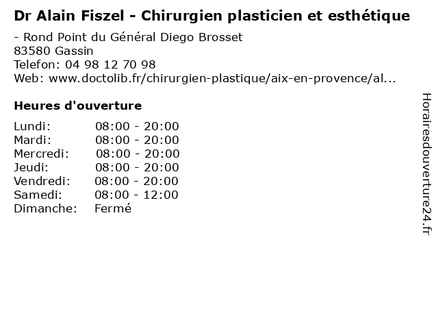 1 Dr Alain Fiszel - Chirurgien plasticien et esthétique (Distance: 0,41 km) - RD 559 - Rond Point du Général Diego Brosset, 83580 Gassin age, alain, chirurgien, dr, esthétique, et, fiszel, medecin, morphologie, morphologue, plasticien 2 Alain Afflelou (Distance: 1,26 km) 120 Rond-Point De La Foux, 83580 Gassin afflelou, alain, lentilles, lunettes, montures, opticien, optique 3 Opticien Gassin | Alain Afflelou (Distance: 1,30 km) Centre Commercial Géant, 83580 Gassin afflelou, alain, gassin, magasin de lunettes de soleil, magasin d’accessoires de mode, opticien, optométrie 4 Dr Michel Chabaud - Chirurgien plasticien et esthétique (Distance: 1,58 km) - Rond-Point du Général Diego Brosset, 83580 Gassin chabaud, chirurgien, dr, esthétique, et, michel, plasticien 5 Centre Esthétique Automobile - Juillet-Août (Distance: 2,58 km) . Montée Bertaud, 83580 Gassin août, automobile, centre, esthétique, juillet, lavage, lustrage, nettoyage 6 Centre Esthétique Automobile - Septembre à juin (Distance: 2,58 km) . Montée Bertaud, 83580 Gassin automobile, centre, esthétique, juin, lavage, lustrage, nettoyage, septembre  |