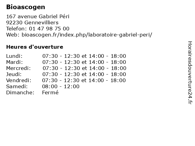 1 Bioascogen (Distance: 0,92 km) 148-150 boulevard Voltaire, 92600 Asnières analyse par rayons x, bioascogen, détection, examenenes de laboratoire 2 Bioascogen (Distance: 1,05 km) 2 place Jean Grandel, 92230 Gennevilliers analyse par rayons x, bioascogen, détection, examenenes de laboratoire 3 Bioascogen (Distance: 2,03 km) 36 rue des Bourguignons, 92600 Asnières analyse par rayons x, bioascogen, détection, examenenes de laboratoire 4 Bioascogen (Distance: 2,05 km) 119 boulevard Marceau, 92700 Colombes analyse par rayons x, bioascogen, détection, examenenes de laboratoire 5 Bioascogen (Distance: 2,79 km) 16 rue Georges Boisseau, 92110 Clichy analyse par rayons x, bioascogen, détection, examenenes de laboratoire 6 Bioascogen (Distance: 5,15 km) 109 rue Ordener, 75018 Paris analyse par rayons x, bioascogen, détection, examenenes de laboratoire |