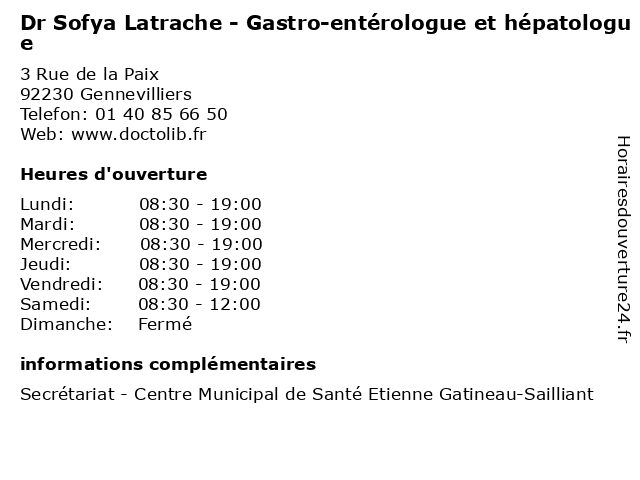 1 Dr Heithem Soliman - Gastro-entérologue et hépatologue (Distance: 0,00 km) 3 Rue de la Paix, 92230 Gennevilliers consultation, docteur, dr, entérologue, et, gastro, heithem, hépatologue, med, médecin, médecine, soliman, traitement 2 Medecin Alain Palacci (hépatologue) (Distance: 2,46 km) 37 Impasse du Noyer Bossu, 93800 Epinay-sur-Seine alain, docteur, hépatologue, medecin, palacci, sante, services 3 Dr Caroline Le Chauff de Kerguenec - Gastro-entérologue et hépatologue (Distance: 5,58 km) 2 rue du Docteur Delafontaine, 93205 Saint-Denis caroline, chauff, consultation, de, docteur, dr, entérologue, et, gastro, hépatologue, kerguenec, le, med, médecin, médecine, traitement 4 Medecin Martine Carlier (hépatologue) (Distance: 6,43 km) 28 Avenue Hoche, 75008 Paris carlier, docteur, hépatologue, martine, medecin, sante, services 5 Dr David Parlier - Gastro-entérologue et hépatologue (Distance: 7,10 km) 72 Avenue d'Iena, 75116 Paris david, dr, entérologue, et, gastro, hépatologue, médecin, médecine, médical, parlier, pharmaceutique, traitement 6 Medecin Nathalie Boyer Darrigrand (hépatologue) (Distance: 7,12 km) 30 Salvadore Allende, 92000 Nanterre boyer, darrigrand, docteur, hépatologue, medecin, nathalie, sante, services |