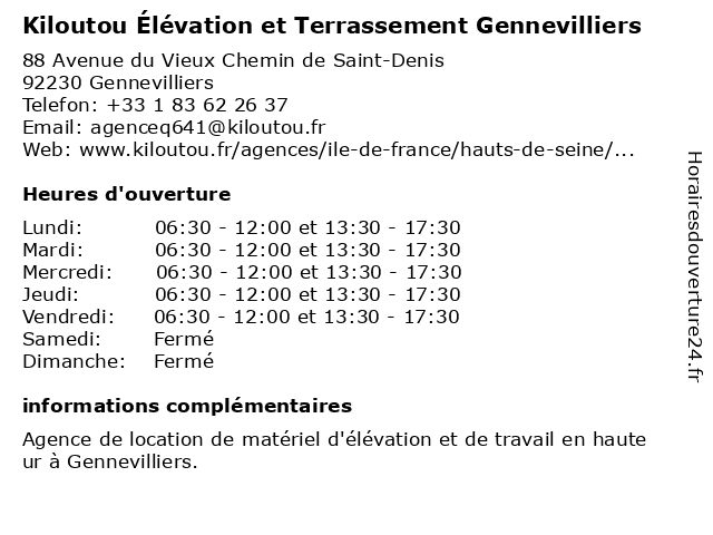 1 Kiloutou Élévation et Terrassement Gennevilliers (Distance: 0,01 km) 88 Avenue du Vieux Chemin de Saint-Denis, 92230 Gennevilliers et, gennevilliers, kiloutou, terrassement, élévation 3 Kiloutou - Direction Commerce et Marketing (Distance: 6,37 km) 8 Rue Gaston Rebuffat, 75019 Paris commerce, direction, et, kiloutou, location de matériel, location matériel btp, location matériel chantier, location outils, marketing 6 |