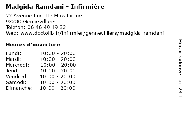 2 Lemoine Véronique - Infirmier - Infirmière (Distance: 2,68 km) 32 Rue du Bournard, 92700 Colombes docteur, infirmier, infirmière, lemoine, medecins, sante, véronique 3 Cristina Henry - Infirmière (Distance: 3,15 km) 44 Boulevard Charles de Gaulle, 92390 Villeneuve-la-Garenne cristina, henry, infirmier, infirmiere, infirmière, sante, soins 4 Infirmière d'Education thérapeutique Marie Rouvrais - Médecine interne (Consultation sur rendez-vous) (Distance: 3,23 km) 100 Bd du général Leclerc, 92110 Clichy consultation, d'education, docteur, infirmière, interne, marie, medecins, médecine, rendez, rouvrais, santé, sur, thérapeutique, vous 5 Nadia Herburrun - Infirmière (Distance: 3,27 km) 38 Avenue de Verdun, 92390 Villeneuve-la-Garenne herburrun, infirmier, infirmière, medecin, nadia, sante, soins 6 Nadia Herburrun - Infirmière (Distance: 3,85 km) 16 Rue Mechin, 93450 L'Île-Saint-Denis herburrun, infirmier, infirmière, medecin, nadia, sante, soins |