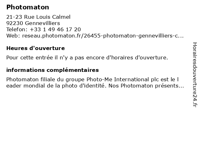 3 Photomaton (Distance: 3,54 km) 50 Avenue du Maréchal Foch, 95100 Argenteuil beaute, cafe, chaussures, enfants, lingerie, mode femmes, mode hommes, photomaton, restaurant, sport 5 Photomaton (Distance: 4,73 km) 8 Route de Saint Leu, 93430 Villetaneuse beaute, cafe, chaussures, enfants, maison, mode femmes, mode hommes, photomaton, restaurant, sport 6 |