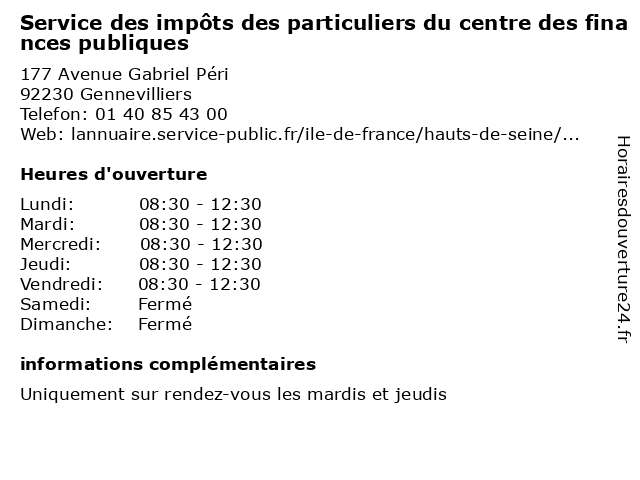 1 Service des impôts des particuliers du centre des finances publiques (Distance: 1,37 km) 51 avenue Flachat, 92600 Asnières-sur-Seine administration, centre, des, du, etat, finances, impots, impôts, particulier, particuliers, publiques, service 2 Service des impôts des particuliers du centre des finances publiques (Distance: 3,35 km) 5 rue du Bournard, 92700 Colombes administration, centre, des, du, etat, finances, impots, impôts, particulier, particuliers, publiques, service 3 Service des impôts des particuliers du centre des finances publiques (Distance: 6,76 km) 17 place de l'Argonne, 75019 Paris administration, centre, des, du, etat, finances, impots, impôts, particulier, particuliers, publiques, service 4 Service des impôts des particuliers du centre des finances publiques (Distance: 7,40 km) 9 place Saint-Sulpice, 75006 Paris administration, centre, des, du, etat, finances, impots, impôts, particulier, particuliers, publiques, service 5 Service des impôts des particuliers du centre des finances publiques (Distance: 7,97 km) 13 rue du Général Beuret, 75015 Paris administration, centre, des, du, etat, finances, impots, impôts, particulier, particuliers, publiques, service 6 Service des impôts des particuliers du centre des finances publiques (Distance: 10,86 km) 101 rue de Tolbiac, 75013 Paris administration, centre, des, du, etat, finances, impots, impôts, particulier, particuliers, publiques, service |