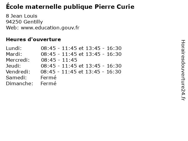 | Lundi | 08:45-11:45 et 13:45-16:30 |