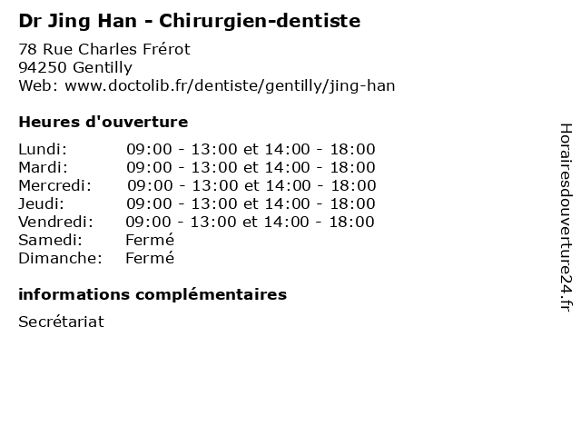 3 Dr Jing Luo - Psychiatre (Distance: 4,10 km) 97 Boulevard Paul Vaillant Couturier, 94240 L'Haÿ-les-Roses cabinet, consultation, dr, jing, luo, psychiatre, psychiatrie, santé, thérapie 4 Restaurant Han Gang (Distance: 5,29 km) 59 Avenue Félix Faure, 75015 Paris bar, café, cunxingt, gang, han, liu, restaurant, restaurants 5 Dr Nguyet-Han Cao - Chirurgien-dentiste (Distance: 5,44 km) 110 Rue de Montreuil, 75011 Paris cao, chirurgien, dentaire, dentiste, dr, han, implantologie, nguyet, parodontologie 6 |