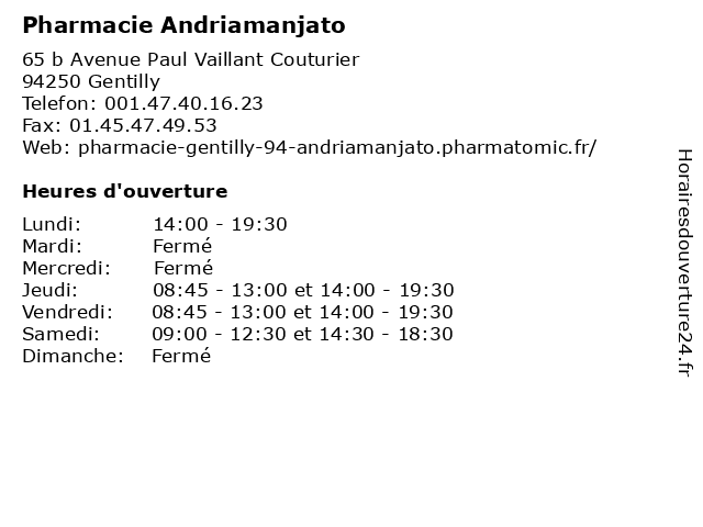 | Jeudi | 08:45-13:00 et 14:00-19:30 |