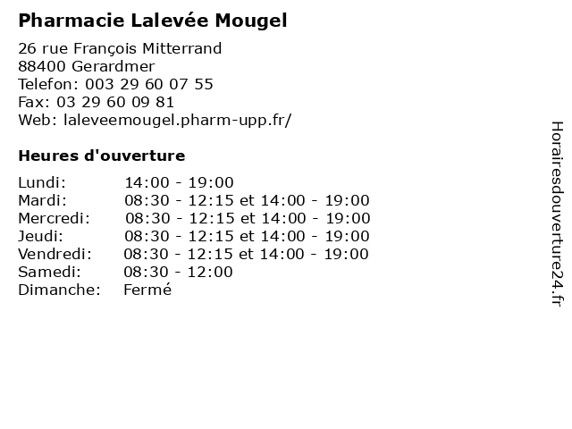 | Mercredi | 08:30-12:15 et 14:00-19:00 |