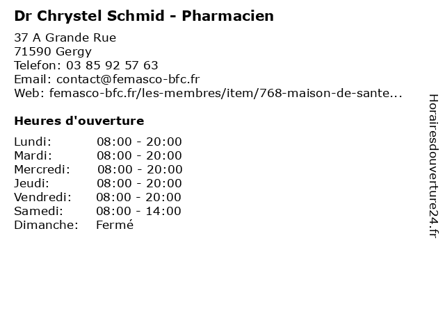 1 Dr Christelle Jankech - Pharmacien (Distance: 0,00 km) 37 A Grande Rue, 71590 Gergy christelle, consultation, docteur, dr, jankech, med, médecin, pharmacien, traitement 2 Dr Anne Neiger - Pharmacien (Distance: 0,00 km) 37 A Grande Rue, 71590 Gergy anne, consultation, docteur, dr, med, médecin, neiger, pharmacien, traitement 3 Dr Jean-François Penaud - Pharmacien hospitalier (Distance: 14,70 km) 4 Rue Capitaine Drillien, 71321 Chalon-sur-Saône cachet, centre, chalon, dr, françois, hospitalier, jean, medicament, penaud, pharmacie, pharmacien, saône, sur 4 Dr Jérôme Coutet - Pharmacien hospitalier (Distance: 14,70 km) 4 Rue Capitaine Drillien, 71321 Chalon-sur-Saône cachet, centre, chalon, coutet, dr, hospitalier, jérôme, medicament, pharmacie, pharmacien, saône, sur 5 Dr Laurence Donier - Pharmacien hospitalier (Distance: 14,70 km) 4 Rue Capitaine Drillien, 71321 Chalon-sur-Saône cachet, centre, chalon, donier, dr, hospitalier, laurence, medicament, pharmacie, pharmacien, saône, sur 6 Dr Geneviève Leger - Pharmacien hospitalier (Distance: 14,70 km) 4 Rue Capitaine Drillien, 71321 Chalon-sur-Saône cachet, centre, chalon, dr, geneviève, hospitalier, leger, medicament, pharmacie, pharmacien, saône, sur |