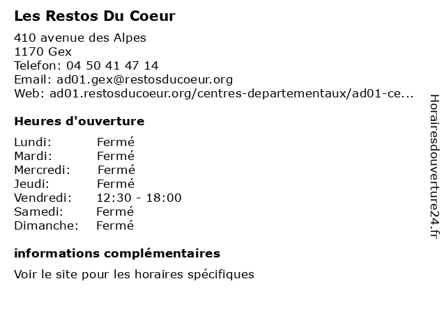 1 Les Restos Du Coeur (Distance: 5,46 km) 73 avenue des Thermes, 01220 Divonne les Bains aides, alimentaire, coeur, du, les, restos, santé, solidarité, soutien 2 Les Restos Du Coeur (Distance: 9,58 km) 5 Avenue des Alpes, 01210 Ferney-Voltaire aides, alimentaire, coeur, du, les, restos, santé, solidarité, soutien 3 Les Restos Du Coeur (Distance: 10,66 km) 20 rue de Pouilly, 01630 Saint Genis Pouilly aides, alimentaire, coeur, du, les, restos, santé, solidarité, soutien 4 Les Restos Du Coeur - Maison Coluche (Distance: 19,95 km) 3 rue Ernest Renan, 74100 Ambilly aides, alimentaire, coeur, coluche, du, les, maison, restos, santé, solidarité, soutien 5 Secours Catholique (Distance: 9,31 km) 1 Rue de Gex, 01210 Ferney Voltaire associatif, association, bénévolat, bénévole, catholique, secours, solidaire, solidarité 6 Etam Lingerie (Distance: 32,95 km) . rue Amédée Foras, 74200 Thonon-les-Bains culotte, etam, femme, lingerie, maillots de bain, prêt à porter, pyjama, soutien-gorge |