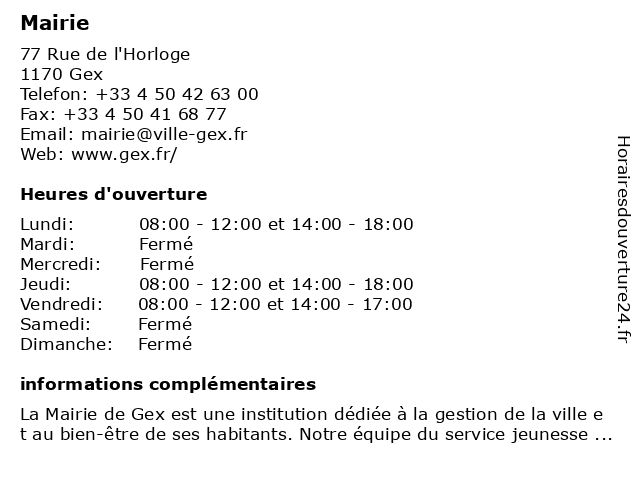4 5 Mairie (Distance: 10,35 km) 94 avenue de la République, 01630 Saint-Genis-Pouilly administration, mairie, publique 6 Mairie (Distance: 15,79 km) 153 rue du Champ-de-Foire, 01630 Saint-Jean-de-Gonville administration, mairie, publique |