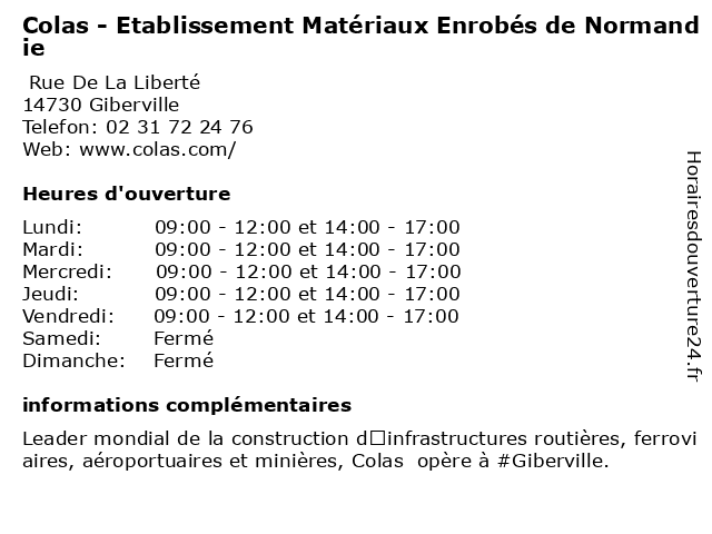 1 CEMEX Matériaux, unité de production béton de Caen - Giberville (Distance: 0,25 km) 55 Rue De La Liberté, 14730 Giberville béton, caen, cemex, de, fournisseur de matériel pour le béton, giberville, matériaux, production, unité 2 AGENCE DEVELOPPEMENT POUR NORMANDIE AD NORMANDIE (Distance: 1,61 km) 2 Esplanade Anton Philips, 14460 Colombelles ad, agence, developpement, normandie, pour 3 Castorama (cour des matériaux) (Distance: 3,38 km) - Rue des Siettes, 14200 Herouville-Saint-Clair bricolage, castorama, cour, des, matériaux 4 Eurovia - Société Matériaux Caennais (Distance: 4,34 km) - Zone Portuaire, 14550 Blainville Sur Orne assainissement, caennais, eurovia, génie civil, liant d'usine, matériaux, société, travaux ferroviaires, travaux routiers, usine d'asphalte 5 Etablissement Martenat (Distance: 4,36 km) 1 Rue des Coursons, 14630 Cagny camion, entretien, etablissement, garage, martenat, réparation, véhicules 6 Investir Immobilier Normandie (Distance: 5,30 km) Jacobins 51 Rue Des, 14000 Caen immobilier, immobilière, investir, lotissement, normandie, nra, promotion, sociétés |