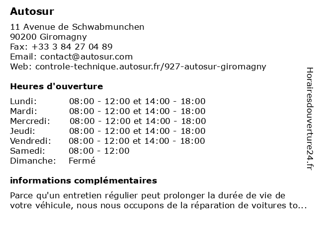 2 AUTOSUR BAVILLIERS (Distance: 12,57 km) Lieu-dit Le Champ Varteau, 90800 Bavilliers autosur, bavilliers 6 AUTOSUR LE VAL-D'AJOL (Distance: 33,18 km) Zone d'activité du Centre, 88340 Le Val-d'Ajol autosur, d'ajol, le, val |