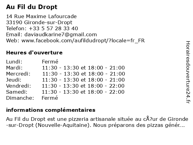 | Mardi | 11:30-13:30 et 18:00-21:00 |