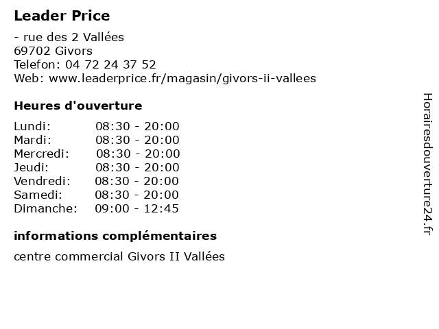 1 Leader Price (Distance: 1,44 km) 9 rue Victor Hugo, 69700 Givors fruits, leader, market, price, supermarket 2 Leader Price (Distance: 10,99 km) - RUE Garon, 69560 Ste colombe fruits, leader, market, price, supermarket 3 Leader Price (Distance: 11,29 km) - Rue Baudrand, 69540 Irigny fruits, leader, market, price, supermarket 4 Leader Price (Distance: 14,24 km) 43 Avenue Paul Doumer, 69630 Chaponost fruits, leader, market, price, supermarket 5 Leader Price (Distance: 17,37 km) - Avenue Debourg, 69007 Lyon fruits, leader, market, price, supermarket 6 Leader Price (Distance: 17,99 km) 258-260 Chemin de Fontanière, 69350 Rhône fruits, leader, market, price, supermarket |