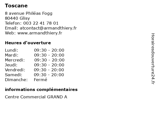 1 Toscane (Distance: 52,88 km) 2 rue Louvet, 60000 Beauvais boutique, grande taille, mode, toscane, vêtements 2 Soleil De Toscane (Distance: 54,02 km) 169 b Route De Bapaume, 62000 Arras restaurants, soleil, toscane 3 Toscane (Distance: 55,16 km) 225 Avenue Winston Churchill, 62000 Arras accessoires, mode, toscane, vêtements 4 Toscane (Distance: 59,43 km) - Place du Marché aux Herbes, 60200 Compiègne accessoires, femme, homme, mode, toscane, vêtements 5 Micromania (Distance: 0,00 km) 8 avenue Philéas Fogg, 80440 Glisy accessoires, cafe, deco, enfants, femme, micromania, mode, restaurant, shopping 6 Minelli (Distance: 0,00 km) 8 avenue Philéas Fogg, 80440 Glisy accessoires, minelli, mode, mode pour femmes, vêtements pour femmes |