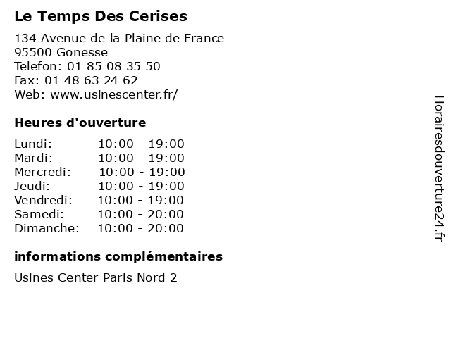 1 Le Temps des Cerises (Distance: 2,55 km) 30 rue des Buissons, 95718 Roissy Charles de Gaulle accessoires, cerises, des, habillement, le, mode, pret à porter, temps, vêtements 2 Le Temps Des Cerises (Distance: 10,88 km) . Avenue du Général-de-Gaulle, 93117 Rosny-Sous-Bois beaute, cafe, cerises, chaussures, des, enfants, le, mode femmes, mode hommes, restaurant, sport, temps 3 Le Temps Des Cerises (Distance: 13,27 km) 8/9 Quai du Chatelier, 93450 L'Ile Saint Denis beaute, cerises, chaussures, des, le, lingerie, mode enfants, mode femmes, mode hommes, sport, temps 5 Le Temps des Cerises (Distance: 16,77 km) 27 Rue Etienne Marcel, 75001 Paris accessoires, cerises, des, habillement, le, mode, pret à porter, temps, vêtements 6 Le Temps des Cerises (Distance: 17,04 km) 31 Rue de la Cerisaie, 75004 Paris bar, bistro, bistrot, brasserie, café, cerises, des, le, restaurant, restauration, temps |