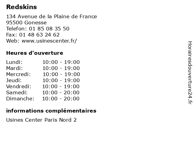 1 Redskins (Distance: 2,74 km) . Le Haut de Galy, 93600 Aulnay-sous-Bois cafe, chaussures, enfants, lingerie, mode femmes, mode hommes, redskins, restaurant, sport 2 Redskins (Distance: 10,88 km) . Avenue du Général-de-Gaulle, 93117 Rosny-Sous-Bois beaute, cafe, chaussures, enfants, hommes, lingerie, mode femmes, redskins, restaurant, sport 3 Redskins (Distance: 10,94 km) 2 avenue Charles de Gaulle, 93110 Rosny-sous-Bois accessoires, divers, habillement, magasins, redskins, territoire 4 Redskins (Distance: 17,05 km) 26 rue de la Reynie, 75001 Paris enfants, femme, homme, magasins, mode, redskins 5 Redskins (Distance: 17,47 km) 31 Rue d Alsace, 92300 Levallois alimentation, beauté & santé, culture & loisirs, enfants, high-tech, maison & déco, mode, redskins, restaurants 6 Redskins (Distance: 19,50 km) 30 Avenue d'Italie, 75013 Paris cafe, enfants.chaussures, lingerie, mode hemmes, mode homme, redskins, restaurant |