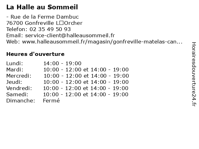 1 La Halle au Sommeil (Distance: 7,78 km) 103 Avenue René Coty, 76600 Le Havre accessoires, au, convertibles, halle, la, matelas, sommeil, sommiers 2 La Halle Le Havre Montivilliers La Lezarde (Distance: 3,06 km) 47 Avenue Maréchal Foch, 76290 Montivilliers halle, havre, la, le, lezarde, montivilliers 3 La Halle (Distance: 7,05 km) 70 Quai Frissard, 76600 LE HAVRE accessoires, bons plans, chaussures, chemise, halle, la, la halle, maroquinerie, mode bébé, mode enfant, mode femme, mode homme, pantalon, pas cher, petits prix, promotions, prêt à porter, pull, robe, t shirt, veste, vêtements 4 La Halle (Distance: 9,98 km) 19 Rue du Dauphin, 14600 Honfleur accessoires, bons plans, chaussures, chemise, halle, la, la halle, maroquinerie, mode bébé, mode enfant, mode femme, mode homme, pantalon, pas cher, petits prix, promotions, prêt à porter, pull, robe, t shirt, veste, vêtements 5 Home Salons (Distance: 0,00 km) - Rue de la Ferme d'Ambuc, 76700 Gonfreville l'Orcher canapés, fauteuils, home, salons 6 Mon lit et moi (Distance: 0,10 km) s/n Parc de l'Estuaire, 76700 Gonfreville-l'Orcher et, lit, magasins.literies, matelas, moi, mon |