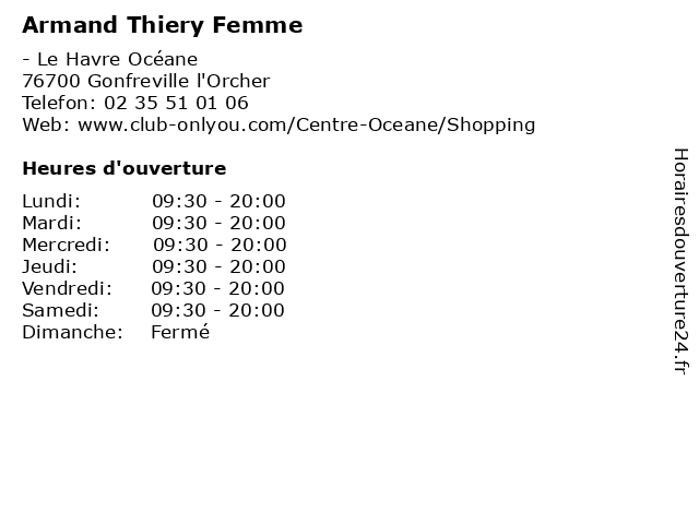 1 Armand Thiery Femme (Distance: 3,53 km) 57 Avenue du Camp Dolent, 76700 Gonfreville-l'Orcher accessoires, armand, femme, habillement, mode, pret à porter, thiery, vêtements 2 Armand Thiery Femme (Distance: 4,03 km) 22 Rue Casimir Périer, 76600 Le Havre alimentation, armand, beauté & santé, culture & loisirs, enfants, femme, high-tech, maison & déco, mode, restaurants, thiery 3 Armand Thiery Homme (Distance: 4,03 km) 22 Rue Casimir Périer, 76600 Le Havre alimentation, armand, beauté & santé, culture & loisirs, enfants, high-tech, homme, maison & déco, mode, restaurants, thiery 4 Bibliothèque Armand Salacrou - Vacances scolaires (Distance: 4,10 km) 17 Rue Jules Lecesne, 76600 Le Havre armand, bibliothèque, cd, dvd, jeux videos, livres, revues, salacrou, scolaires, vacances 5 Bibliothèque Armand Salacrou (Distance: 4,19 km) 17 Rue Jules Lecesne, 76085 Le Havre armand, bibliothèque, livre, médiathèque, salacrou, services 6 Armand Loiselet - Pédicure-podologue (Distance: 17,67 km) 4 place de l'Ile, 76280 Criquetot-l'Esneval armand, loiselet, pedicure, pied, podologue, pédicure, sante |