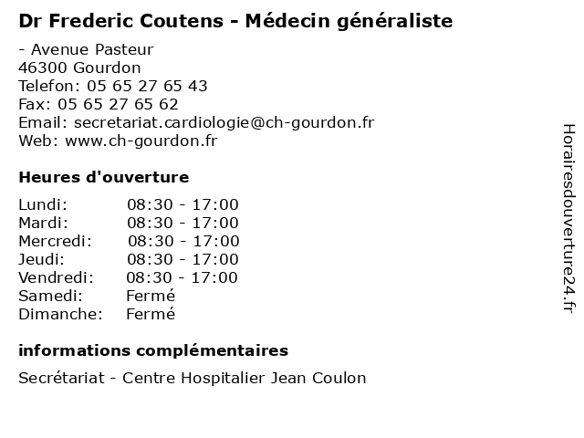 Termes de recherche pour Dr Frederic Coutens - Médecin généraliste:gourdon, jean, centre, frédéric, general, soins, généraliste, hospitalier, coulon, coutens, médecin, dr, chirurgien, chiurgie |