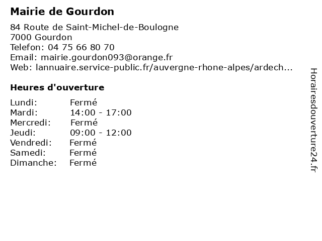 1 Mairie de Gourdon (Distance: 5,10 km) . La Planche, 07000 Gourdon administration, assoc public, de, gourdon, mairie 2 Mairie (Distance: 0,00 km) - Le Village, 07200 St Michel De Boulogne administration, mairie, public, service 3 Mairie (Distance: 2,04 km) - Le Village, 07200 St Etienne De Boulogne administration, mairie, public, service 4 Mairie (Distance: 2,56 km) - Le Village, 07600 Saint-Andéol-de-Vals administration, mairie, public, service 6 Mairie de Genestelle (Distance: 4,10 km) - Le Village, 07530 Genestelle administration, de, genestelle, mairie, public, service |