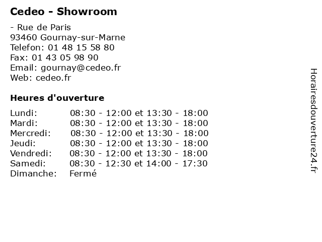 1 Cedeo - Showroom (Distance: 8,00 km) 11 Avenue de la Courtillière, 77400 Saint-Thibault-des-Vignes cedeo, chauffage, climatisation, informations, le, outils, plomberie, sanitaire, showroom, sur, électricité, équipements 2 Cedeo - Showroom (Distance: 9,62 km) 20 Rue du Général de Gaulle, 94510 La Queue-en-Brie cedeo, chauffage, climatisation, informations, le, outils, plomberie, sanitaire, showroom, sur, électricité, équipements 3 Cedeo - Showroom (Distance: 13,98 km) 19 Quai de la Révolution, 94140 Alfortville cedeo, chauffage, climatisation, informations, le, outils, plomberie, sanitaire, showroom, sur, électricité, équipements 4 Cedeo (Distance: 0,00 km) - Rue de Paris, 93460 Gournay-sur-Marne cedeo, chauffage, climatisation, informations, l'agence, outils, plomberie, sanitaire, sur, électricité, équipements 5 Showroom Bellezza (Distance: 7,37 km) 26 Rue Alexandre Boucher, 93410 Vaujours accessoires, bellezza, habillement, mode, showroom, vêtement 6 Cedeo (Distance: 9,62 km) 20 Rue du Général de Gaulle, 94510 La Queue-en-Brie cedeo, chauffage, climatisation, informations, l'agence, outils, plomberie, sanitaire, sur, électricité, équipements |