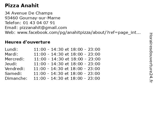 | Lundi | 11:00-14:30 et 18:00-23:00 |