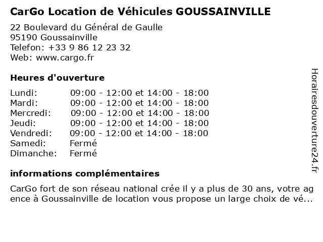 1 CarGo Location de véhicules GOUSSAINVILLE (Distance: 1,82 km) 1 Voie Rosière, 95190 Goussainville cargo, de, goussainville, location, véhicules 2 CarGo (Distance: 2,17 km) 18 rue jean piuerre timbaud, 95190 Goussainville cargo, cars, rental, reservation, services, trucks, vans 3 CarGo (Distance: 5,83 km) n/a Aéroport Paris Charles de Gaulle, 95700 Roissy-en-France cargo, cars, rental, reservation, services, trucks, vans 4 U Location (Distance: 7,15 km) 56 Rue De La Liberation, 95440 Ecouen location, location de voiture, location de véhicules, super, véhicules 5 CarGo Location de Véhicules DOMONT (Distance: 9,45 km) 2 Rue Arago, 95330 Domont cargo, de, domont, location, véhicules 6 CarGo Location de Véhicules EZANVILLE (Distance: 9,54 km) 92 Route de Domont, 95460 Ézanville cargo, de, ezanville, location, véhicules |