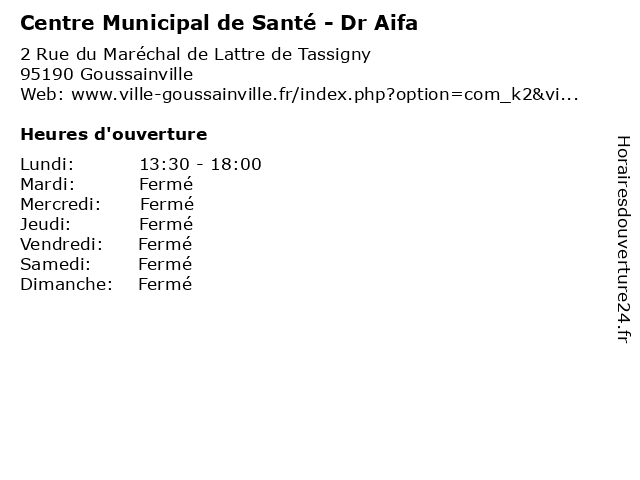 1 Centre Municipal de Santé - Acupuncture (Distance: 0,00 km) 2 Rue du Maréchal de Lattre de Tassigny, 95190 Goussainville acupuncture, bureau, centre, consultation, de, dr, maladie, med, municipal, médecin, médecine, pratique, santé, thérapie, traitement 2 Centre Municipal de Santé Stains (secrétariat) (Distance: 10,70 km) 27-33 Boulevard Maxime Gorki, 93240 Stains centre, consultation, de, docteur, municipal, médecins, santé, secrétariat, stains 3 Mairie de Tremblay-en-France- Service Municipal des Sports (Distance: 10,90 km) . Rue Jules Ferry, 93290 Tremblay En France de, des, en, france, mairie, medecins, municipal, public, service, services, sports, tremblay 4 Pôle Municipal de Santé (Distance: 11,32 km) 7b Cours de la République, 93290 Tremblay En France de, medecins, municipal, public, pôle, santé, services 5 Centre Municipal de Santé (secrétariat ) (Distance: 11,60 km) 6 Avenue Robert Ballanger, 93270 Sevran centre, consultation, de, docteur, municipal, médecins, santé, secrétariat 6 Centre Municipal de Santé (Distance: 13,78 km) 91 Avenue Aristide Briand, 93320 Les Pavillons-sous-Bois bureau, centre, consultation, de, dr, maladie, med, municipal, médecin, médecine, pratique, santé, thérapie, traitement |