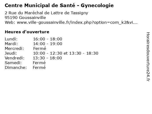 1 Centre Municipal de Santé - Acupuncture (Distance: 0,00 km) 2 Rue du Maréchal de Lattre de Tassigny, 95190 Goussainville acupuncture, bureau, centre, consultation, de, dr, maladie, med, municipal, médecin, médecine, pratique, santé, thérapie, traitement 2 Centre Municipal de Santé Stains (secrétariat) (Distance: 10,70 km) 27-33 Boulevard Maxime Gorki, 93240 Stains centre, consultation, de, docteur, municipal, médecins, santé, secrétariat, stains 3 Mairie de Tremblay-en-France- Service Municipal des Sports (Distance: 10,90 km) . Rue Jules Ferry, 93290 Tremblay En France de, des, en, france, mairie, medecins, municipal, public, service, services, sports, tremblay 4 Pôle Municipal de Santé (Distance: 11,32 km) 7b Cours de la République, 93290 Tremblay En France de, medecins, municipal, public, pôle, santé, services 5 Centre Municipal de Santé (secrétariat ) (Distance: 11,60 km) 6 Avenue Robert Ballanger, 93270 Sevran centre, consultation, de, docteur, municipal, médecins, santé, secrétariat 6 Centre Municipal de Santé (Distance: 13,78 km) 91 Avenue Aristide Briand, 93320 Les Pavillons-sous-Bois bureau, centre, consultation, de, dr, maladie, med, municipal, médecin, médecine, pratique, santé, thérapie, traitement |
