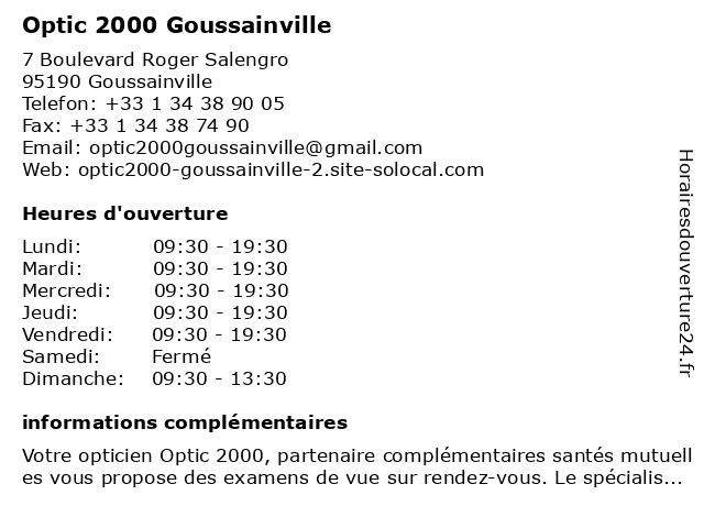 2 Opticien Goussainville - Optic 2000 (Distance: 0,01 km) 7 Boulevard Roger Salengro, 95190 Goussainville 2000, goussainville, lentilles de contact, lunettes de soleil, lunettes de vue, optic, optic2000, opticien, opticien optic2000, ray-ban, rayban 3 Audio 2000 Goussainville (Distance: 0,02 km) 10 Boulevard Roger Salengro, 95190 Goussainville 2000, audio, goussainville 4 Audioprothésiste Goussainville - Audio 2000 (Distance: 0,03 km) 10 Boulevard Roger Salengro, 95190 Goussainville 2000, audio, audioprothésiste, goussainville 5 Assu 2000 (Distance: 0,04 km) 6 Boulevard Roger Salengro, 95190 Goussainville 2000, assu, assurance, maison, moto, santé, services 6 Optic 2000 (Distance: 2,47 km) . Chemin de la Briquetterie, 95380 Louvres 2000, lunettes, optic, santé, solaires |