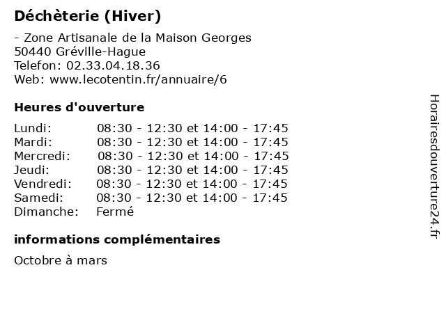 1 Déchèterie (Hiver) (Distance: 13,30 km) - Zone Artisanale Le Pont, 50690 Martinvast débarras, déchets, déchèterie, hiver, mars, octobre, poubelles 2 Déchèterie (Hiver) (Distance: 16,25 km) - Zone Industrielle Les Costils, 50340 Les Pieux débarras, déchets, déchèterie, hiver, mars, mi, octobre, poubelles 6 |