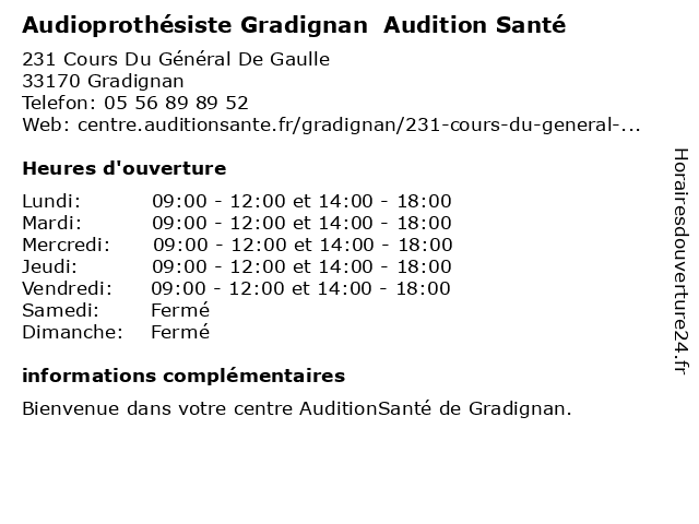 1 Audioprothésiste Gradignan | Alain Afflelou Acousticien - Closed (Distance: 0,40 km) 150 Cours Du Général De Gaulle, 33170 Gradignan acousticien, afflelou, alain, audioprothésiste, closed, gradignan 2 Audition Gradignan (Distance: 0,65 km) 4 Allée des Pins, 33170 Gradignan appareil, audioprothésiste, auditif, audition, centre, gradignan, test 3 Mutuelle Santé Ociane (Distance: 0,68 km) 104 Cours du Général De Gaulle, 33170 Gradignan assurances, mutuelle, mutuelle sante, ociane, santé, services 4 Écouter Voir Audition GRADIGNAN (Distance: 0,73 km) 96 Cours du Général de Gaulle, 33170 Gradignan audition, gradignan, voir, écouter 5 Audioprothésiste SoluSons - Gradignan (Distance: 0,73 km) 2 Place Bernard Roumégoux, 33170 Gradignan audioprothésiste, gradignan, solusons 6 Audition Santé (Distance: 2,30 km) 6 allée de Carthon Ferrière, 33170 Gradignan audioprothèse, audioprothésiste, audition, santé |