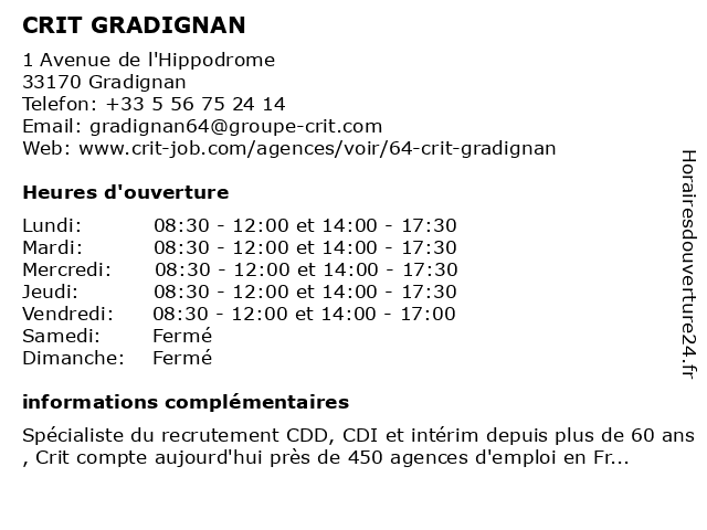 2 Crit Job (Distance: 10,05 km) 28 avenue Thiers, 33100 Bordeaux agence, btp, crit, d'interim, emplois, intérim, job 3 CRIT BORDEAUX Tertiaire (Distance: 10,79 km) 18 Cours Saint-Louis, 33300 Bordeaux bordeaux, crit, tertiaire 4 CRIT BORDEAUX Experts & Cadres (Distance: 10,79 km) 18 Cours Saint-Louis, 33300 Bordeaux bordeaux, cadres, crit, experts 5 Crit Job (Distance: 12,00 km) 78 avenue du Médoc, 33320 Eysines agence, crit, emplois, intérim, job, offres 6 CRIT BORDEAUX Logistique (Distance: 12,01 km) 493 Avenue du Médoc, 33520 Bruges bordeaux, crit, logistique |