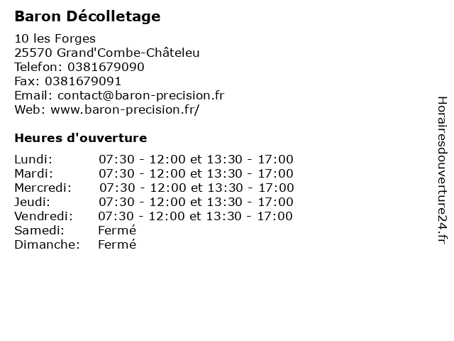 1 SAS Grandidier (Distance: 0,08 km) - Les Grands Saules, 25570 Grand'Combe-Châteleu décolletage, grandidier, pièces, pièces décolletées, sas, usinage 2 Europcar (Distance: 21,03 km) 2 rue edgar faure, 25300 Pontarlier europcar, location de voitures, location de voitures de luxe, location de véhicules utilitaires, véhicules 3 Dr Judith Baron - Médecin généraliste - secrétariat (Distance: 22,09 km) 4b La Tuilerie, 25300 La Cluse-et-Mijoux baron, consultation, docteur, dr, généraliste, judith, med, médecin, médecine, secrétariat, traitement 4 DDLG - Décolletage de la Garenne (Distance: 32,44 km) 6 Rue de la Garennes, 25290 Ornans ddlg, de, décolletage, garenne, la, pièces, pièces décolletées, usinage 5 Baron Frederic (Distance: 43,42 km) 11 Place Général de Gaulle, 25150 Pont-de-Roide-Vermondans baron, frederic 6 Europcar (Distance: 54,34 km) n/a Gare de besancon, 25870 Auxon europcar, location de voitures, location de voitures de luxe, location de véhicules utilitaires, véhicules |
