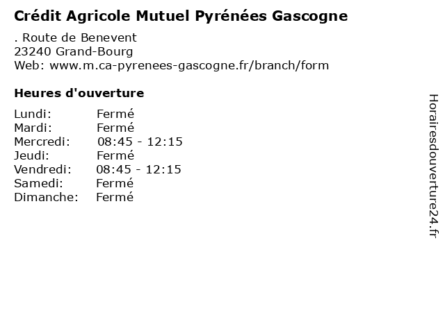 1 Crédit Agricole Mutuel Pyrénées Gascogne (Distance: 4,02 km) 16 Rue du Marché, 23210 Benevent L'Abbaye agricole, assurances, bancaire, banque, crédit, gascogne, mutuel, pyrénées, services 2 Crédit Agricole (Distance: 7,47 km) - Rue du Presbytère, 23240 Le Grand Bourg agence, agricole, assurance, bancaire, banque, crédit 3 Crédit Agricole (Distance: 13,33 km) 21 Grande Rue, 23290 Saint-Pierre-de-Fursac agence, agricole, assurance, bancaire, banque, crédit 4 Crédit Agricole (Distance: 14,07 km) - Place de l'Eglise, 23320 Saint-Vaury agence, agricole, assurance, bancaire, banque, crédit 5 Crédit Agricole Centre Ouest (Distance: 14,83 km) 18 Place du Général Thoumas, 87370 Laurière agricole, centre, crédit, ouest 6 Crédit Agricole (Distance: 16,93 km) 2 Rue de l'Etang, 23400 Bourganeuf agence, agricole, assurance, bancaire, banque, crédit |