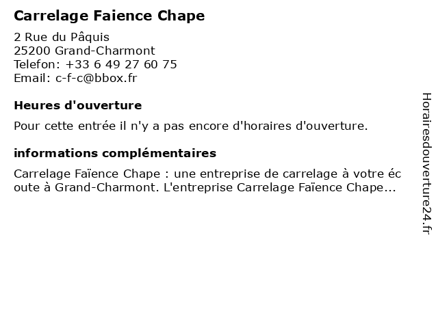 2 JB CARRELAGE DESIGN 2 (Distance: 8,90 km) 12 Route De Montbeliard, 90400 Andelnans carrelage, design, jb 4 Carrière de Cernay - Michel SAS (Distance: 39,20 km) - La Croisière de Cernay, 68700 Cernay carrière, cernay, chape, de, graviers, michel, mortiers, sables, sas 5 Chape Isol (Distance: 40,06 km) 137 Faubourg des Vosges, 68700 Cernay chape, ciment, construction, isol, isolation, rénovation 6 MULIN RODOLPHE CARRELAGES (Distance: 41,23 km) Rue sur le Chaillé, 25110 Baume-les-Dames carrelage, carrelages, carreleur dans le doubs, chape liquide, faïence, mulin, rodolphe, salle de bain clé en main |