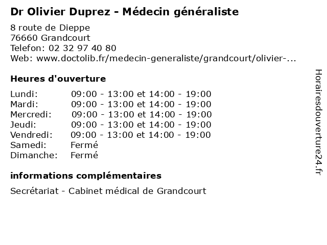1 Dr Olivier Trancart - Médecin généraliste (Distance: 0,00 km) 8 route de Dieppe, 76660 Grandcourt docteur, dr, generaliste, généraliste, medical, médecin, olivier, soin, trancart 2 Boucherie Notre Dame Olivier Pere Et Fil s (Distance: 10,04 km) 6 Rue Masse De Cormeilles, 76340 Blangy Sur Bresle boucherie, boucheries, dame, fil, olivier, pere, poissonneries 3 Boucherie-charcuterie Olivier Breuque (Distance: 11,06 km) 10 Rue Du General De Gaulle, 76660 Londinières boucherie, boucheries, breuque, charcuterie, louis, olivier, poissonneries, sebastien 4 Medecin Stephanie Pauwels Duprez (Angiologue) (Distance: 38,11 km) 5 Rue du Capitaine Fay, 80290 Poix-de-Picardie angiologue, docteur, duprez, medecin, pauwels, sante, services, stephanie 5 Cabinet Medical - Chirurgie orthopédique (secrétariat ) (Distance: 29,68 km) 1328 Avenue de la maison blanche, 76550 Saint-Aubin-sur-Scie 0276203040, cabinet, chirurgie, consultation, docteur, medical, orthopédique, santé, secrétariat 6 Domidom (Distance: 55,12 km) 272 Rue de l'Impératrice, 62600 Berck aide à domicile, alzheimer, domidom, dépendance, medical, services |