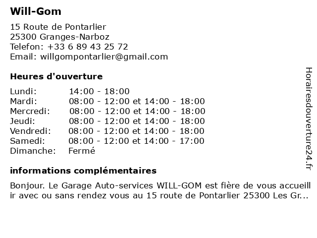 Bonjour. Le Garage Auto-services WILL-GOM est fière de vous accueillir avec ou sans rendez vous au 15 route de Pontarlier 25300 Les Granges-Narboz. Un garage tout beau tout neuf, avec du matériel...